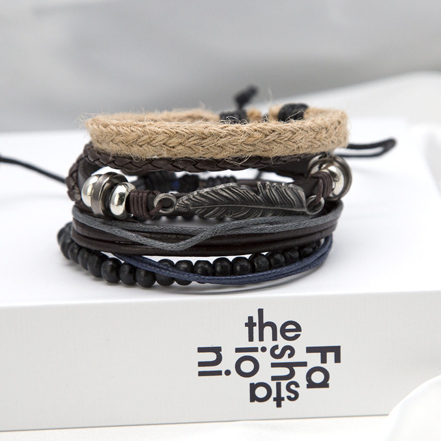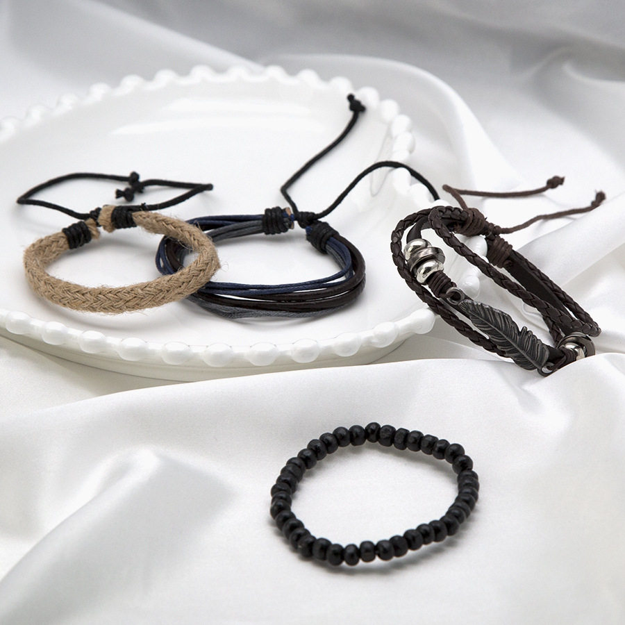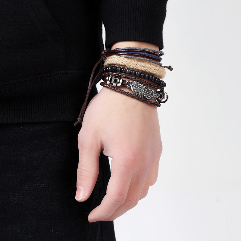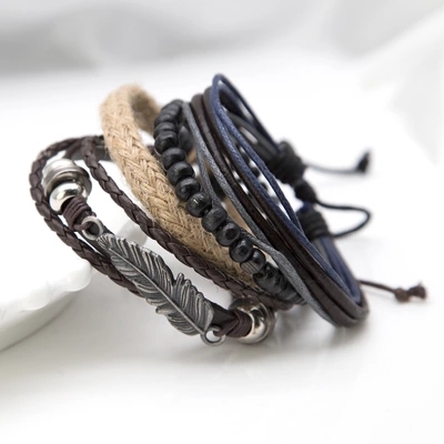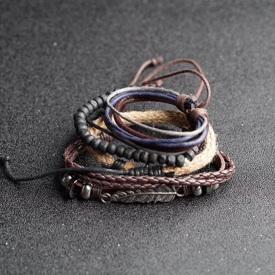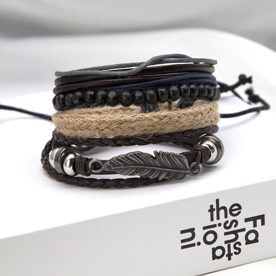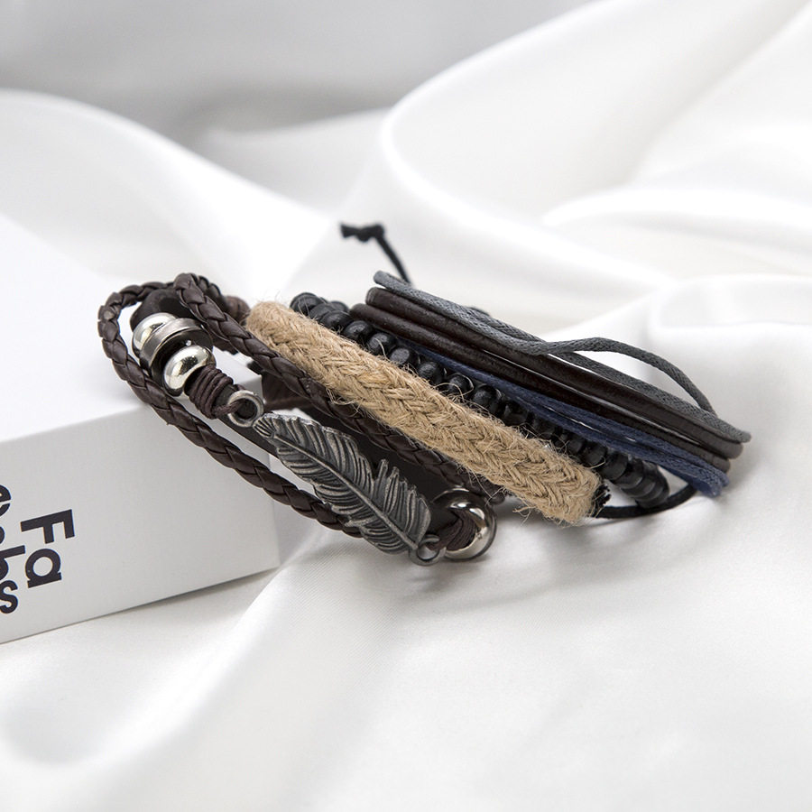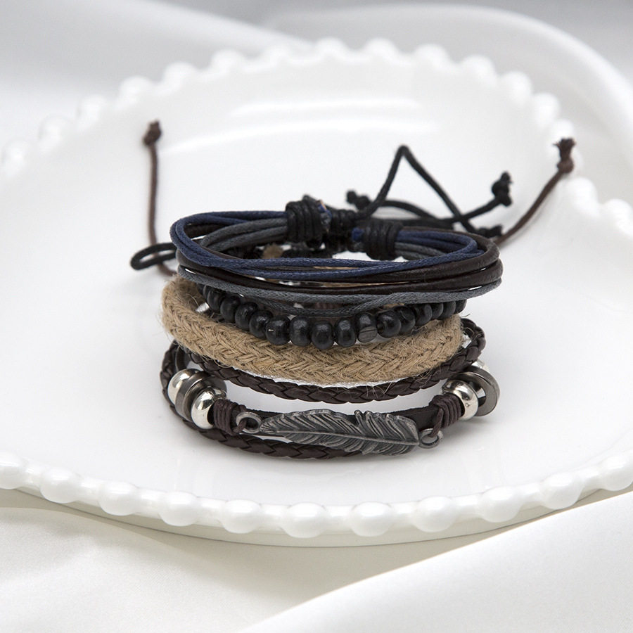 新款欧美树叶子手链 纯手工小牛皮麻绳木珠多根组合手饰